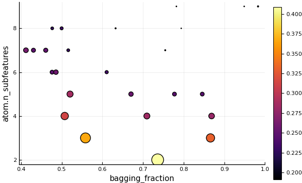 julia> forest_model = EnsembleModel(atom=tree_model);Ranges for nested hyperparameters are specified using dot syntax. In this case we will specify a goal for the total number of grid points: